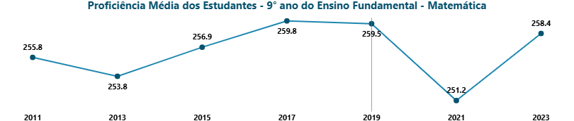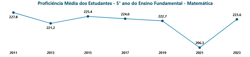 Embora o município do Rio de Janeiro tenha 660 mil alunos distribuídos em 1556 unidades escolares, a reportagem não questionou os critérios utilizados pela pesquisa para selecionar a amostra. Não foram apresentados os dados de rendimento escolar utilizados para chegar a tais números, nem a quais anos escolares tais números se referiam. Também não foram apresentadas eventuais variáveis para o aumento médio das notas (como uma parceria entre a prefeitura do Rio e a Universidade de Stanford, para a formação de professores de matemática). A questão é relevante, pois, desde o fim da pandemia de covid-19, o aproveitamento geral dos estudantes em matemática e língua portuguesa tem aumentado de forma gradual no Brasil todo, conforme dados do Sistema de Avaliação da Educação Básica (SAEB). No município do Rio, o SAEB de 2023, anterior à proibição do celular, já indicava uma tendência de crescimento da proficiência média dos estudantes do 9º ano do ensino fundamental em matemática. No caso do 5o ano, esse aumento de 2021 a 2023, antes da proibição dos celulares, foi de 8,3%, conforme demonstram os gráficos abaixo.